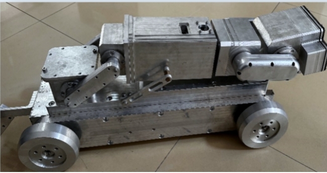本款管道机器人专为市政雨污水管道巡检与维护设计,适用于内径300mm及以上工况,采用高适应性四轮驱动结构,创新式地结合三自由度机械臂创新架构,实现管道内全向移动与精准作业,其机器人的行走速度能够达到0.1m/s,最大爬坡角度为15°。其核心优势在于模块化设计,机身可快速拆解为四大功能模块:行走刚体、抬升模块、回转模块、俯仰模块。